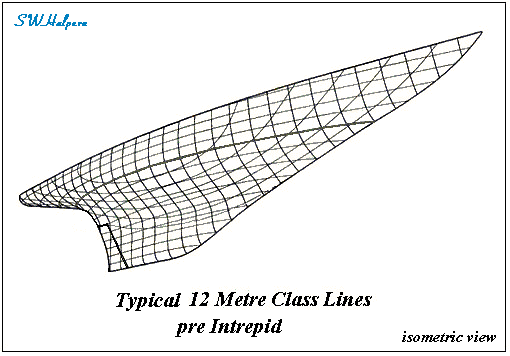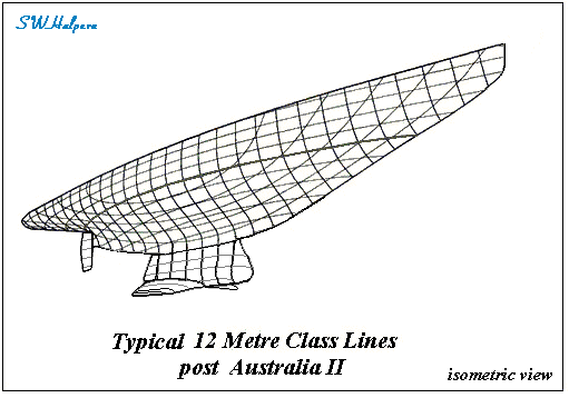 | From 1958 to 1987, the "12-Meter" Rule was used to ensure that similar designs competed for the America's Cup, while still encouraging yacht designers to balance several key design factors in order to produce the fastest boats possible. The rating formula was: R = (L + 2d + sqrt[S] - F)/2.37 = 12 meters Where: L = The length measured at a height of 1.5% of the class rating (12 meters) above the flotation line, adjusted for the girth measurements forward and aft. d = The difference between the skin girth and the chain girth, measured vertically in the transverse section at 55% of LWL from the covering board to a point 12.5% of the class rating below the waterline. F = freeboard between the skin girth and the chain girth, measured vertically in the transverse section at 55% of LWL, from the covering board to a point 12.5% of the class rating below the waterline. S = Sail area controlled by spar dimensions and consisting of the sum of the mainsail area plus 85% of the fore triangle. By increasing or decreasing the length of the hull, sail area and freeboard, the designer attempts to balance these effects with the shape of hull, keel and rudder while trying to create the least amount of resistance, the greatest amounts of stability and lift. Olin Stephens' Intrepid of 1967 was a breakthrough yacht. Wetted surface was drastically reduced with a shorter keel and separate rudder and trim tab and numerous other refinements. In 1983, the unthinkable happened when Australia II beat Liberty in a sudden- death 7-th match race for the cup. Australia II was the best 12-Metre to sail in the 25-year history of competition off Newport, RI. Her extraordinary and controversial winged keel was the most conspicuous feature, but she was the first boat to go to a minimum length and displacement producing significantly less wetted surface area than any other Twelve. Less wetted surface area comes about from having a smaller displacement boat and from a keel of radically small planform yet providing sufficient hydrodynamic lift (side force) without the conventional large keel area. Significant reduction of hull drag and leeway angle was obtained in Ben Lexcen's Australia II by replacing a traditional keel with an upside–down winged keel. The upside–down keel planform reduces the surface wave drag component by moving the center of the hydrodynamic side force closer to the tip of the keel. Winglets attached to the tip of the keel reduce the induced drag component produced by the relatively small aspect ratio of the keel when sailing to windward. |