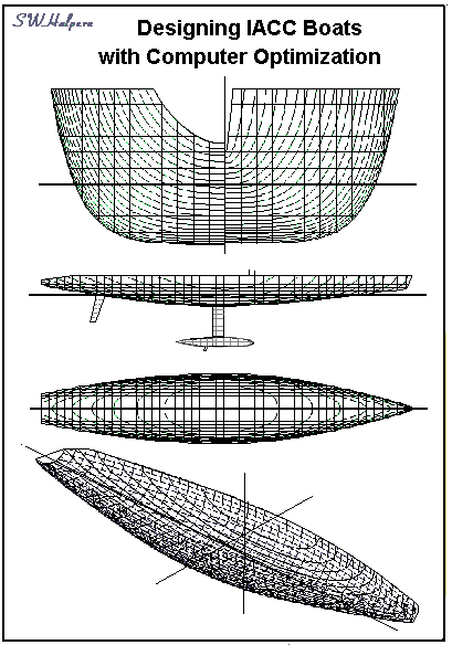 | After 1988 a new rule was established for the Amewrica's Cup. Boats of the IACC are larger than 12-Metre yachts with much finer and lighter hulls utilizing composite construction. The ballast to displacement ratio of these boats is very high with a deep lead bulb of about 44,000 pounds supported by a slim steel strut keel. The IACC Rules set stringent design criteria and established a design formula which forces designers to balance boat length against sail area and displacement. The Rule formula is: R = (L + 125 square-root[S] - 9.8 cube-root[D])/0.679 <= 24.0 meters where: L is the rated length in meters; S is the sail area (the sum of the foretriangle and mainsail area) in square meters; and D is the displacement in cubic meters. When the class was first introduced for the 1992 America’s Cup, the IACC rule contained a maximum beam limit of 5.5 metres, and the competing yachts were all close to this limit. Boats of this vintage also had a great deal of topside flare and low midship area coefficient values During the years that followed, the beam of IACC yachts has progressively reduced until today they are less than 3.5 metres wide. Topside flare is now close to zero and CM values have increased to the point that the boats are relatively boxy with slab sides. The complexity of the IAAC design incorporates many factors including a measure of stability, and sail carrying ability, in addition to lift and drag performance. A narrower hull may have less resistance, but it may also have less stability resulting in less sail carrying ability. There is no way of knowing without detailed computer analysis whether a yacht would be faster or slower overall. It is necessary to combine hull lift and drag data with information about the weight, center of gravity and sail plan of the yacht to produce performance curves that prvide a set of polar plots which tell the designer how the boat is expected to perform for different wind strengths and points of sail. |