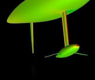 | Flow analysis of the appendages (keel, bulb, winglets, and rudder) of an IACC class design showing the distribution of dynamic pressure along the various surfaces. |
