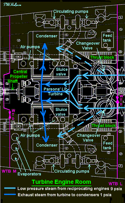 propeller shafts of the reciprocating engines, and the ship’s two main